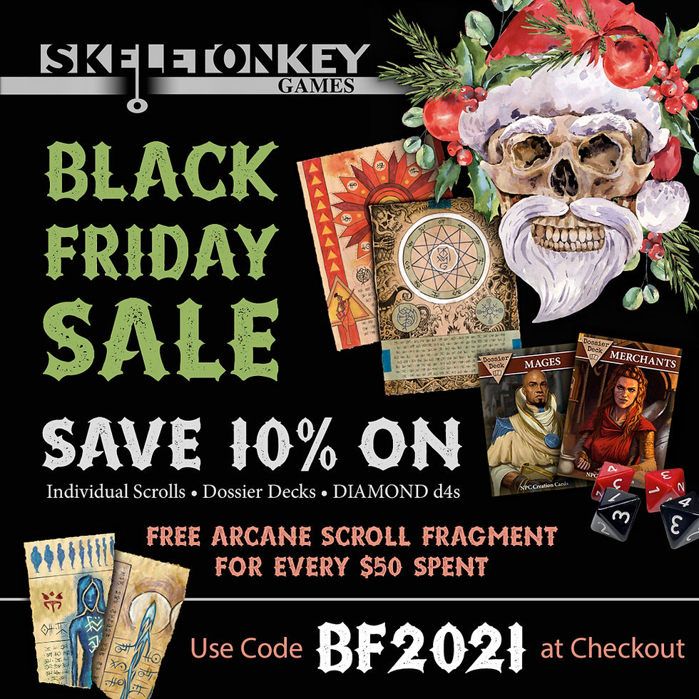 SkeletonKey Games is holding a rare sales event, with 10% off individual scrolls from our Arcane Scrollworks line, Dossier Decks, and DIAMOND d4s. Additionally, we are adding a FREE Arcane Scroll Fragment for each $50 spent in the store*. Browse our products HERE and make sure to use the code BF2021 at checkout to claim your savings.